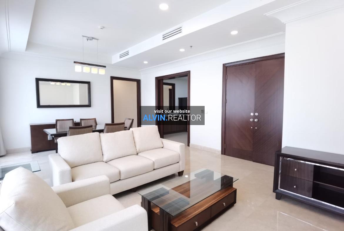 For Rent Apartemen Pakubuwono View, Lacewood Tower, Middle Floor. 3 bedrooms, 2 bathrooms, 1 maidroom and 1 maid bathroom. Size 196 sqm. Fully furnished. Living room facing outdoor facilities and Pakubuwono Residence. Bedrooms facing Gandaria and Arteri street.