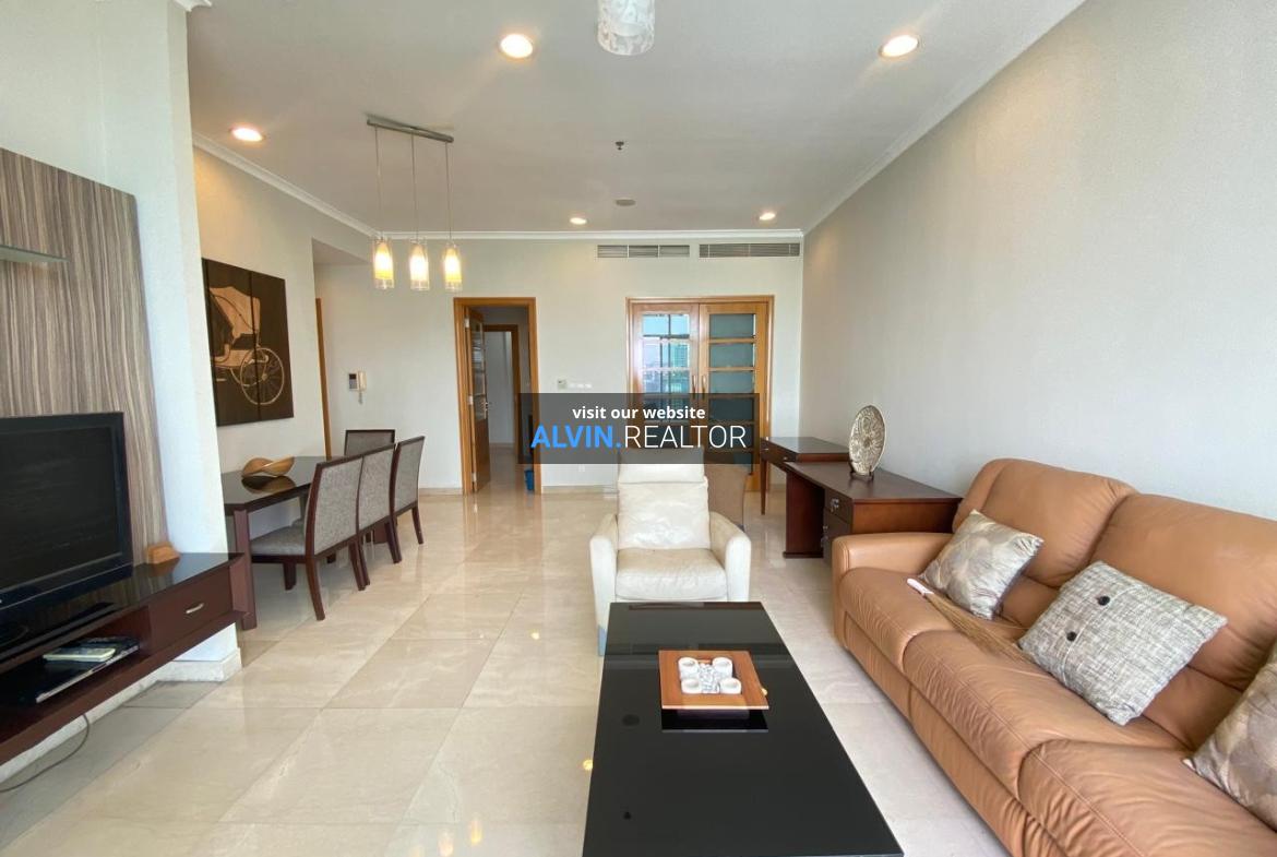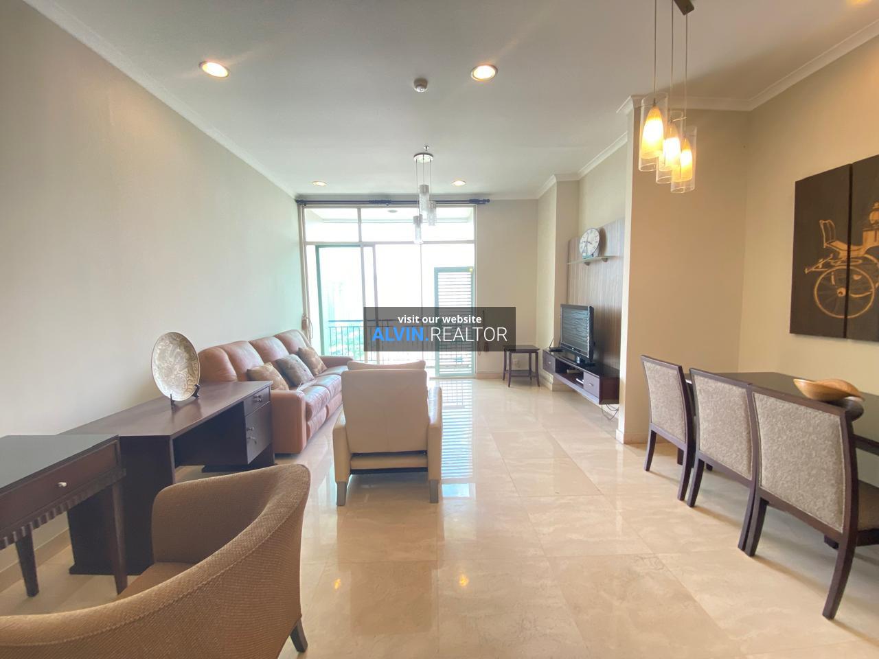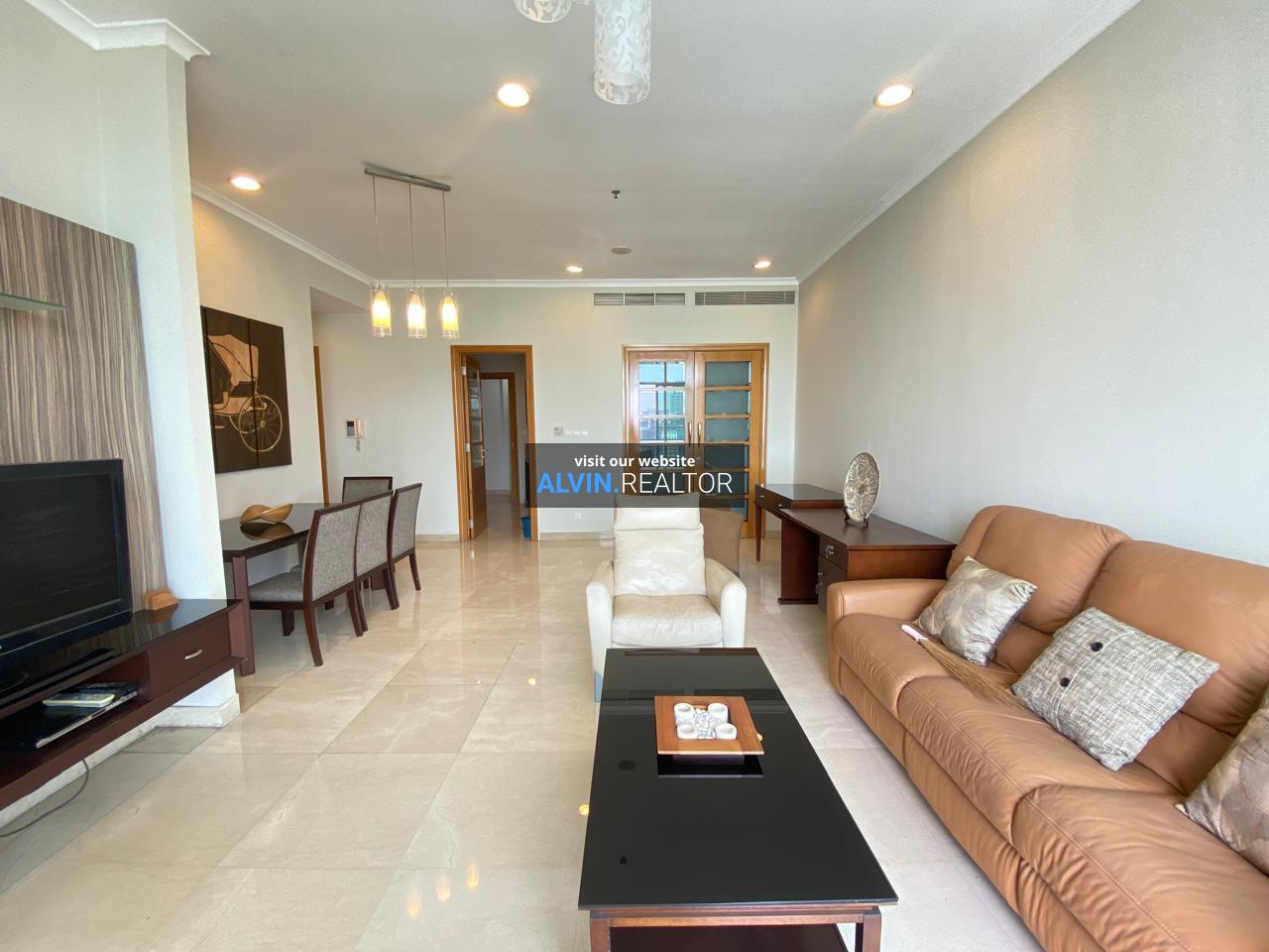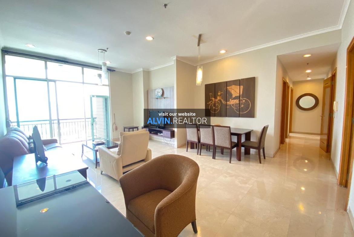 Disewa Apartemen Senayan Residence Tower 2, luas 184 m2, terdiri dari 3 kamar tidur, 2 kamar mandi, maid room, kondisi fully furnished, posisi middle floor.