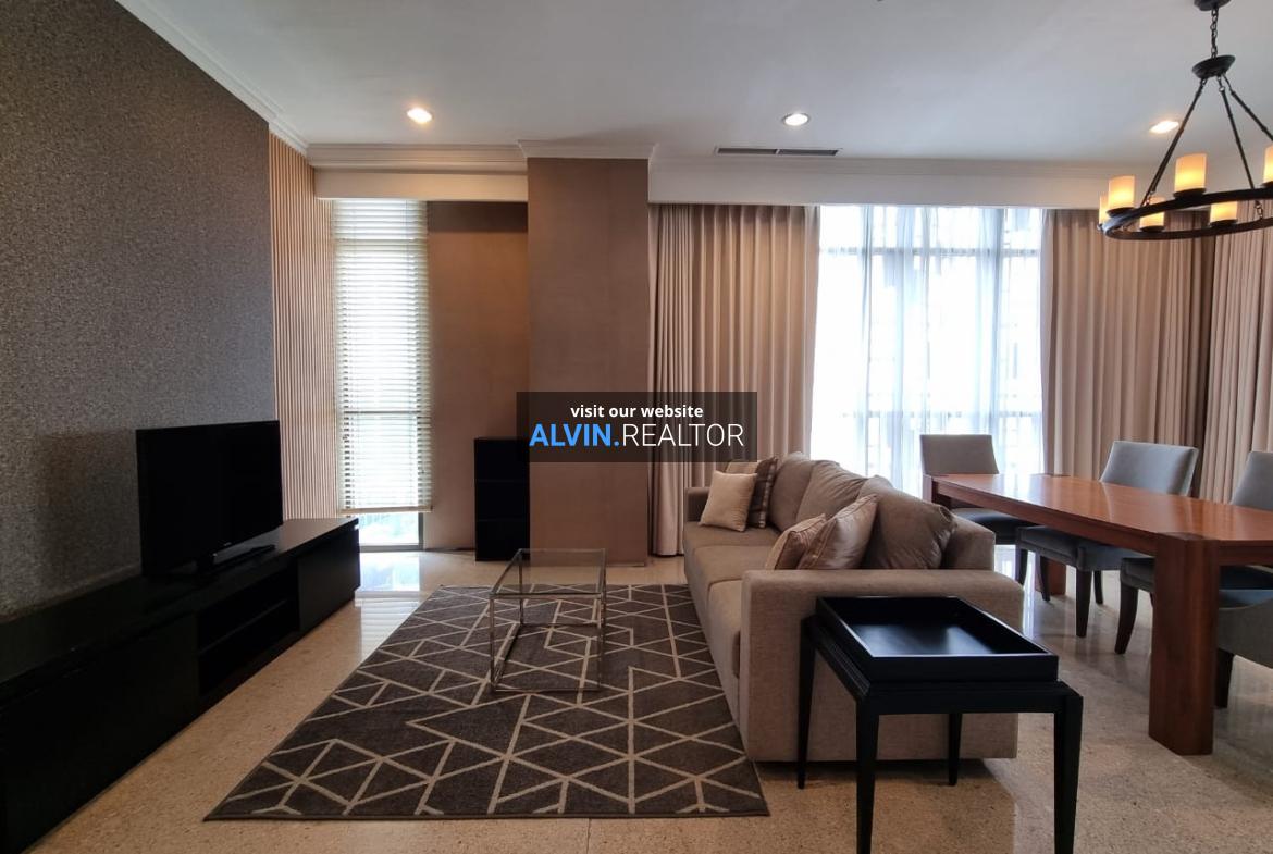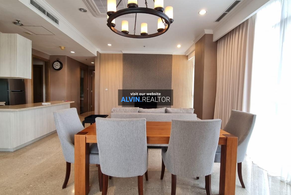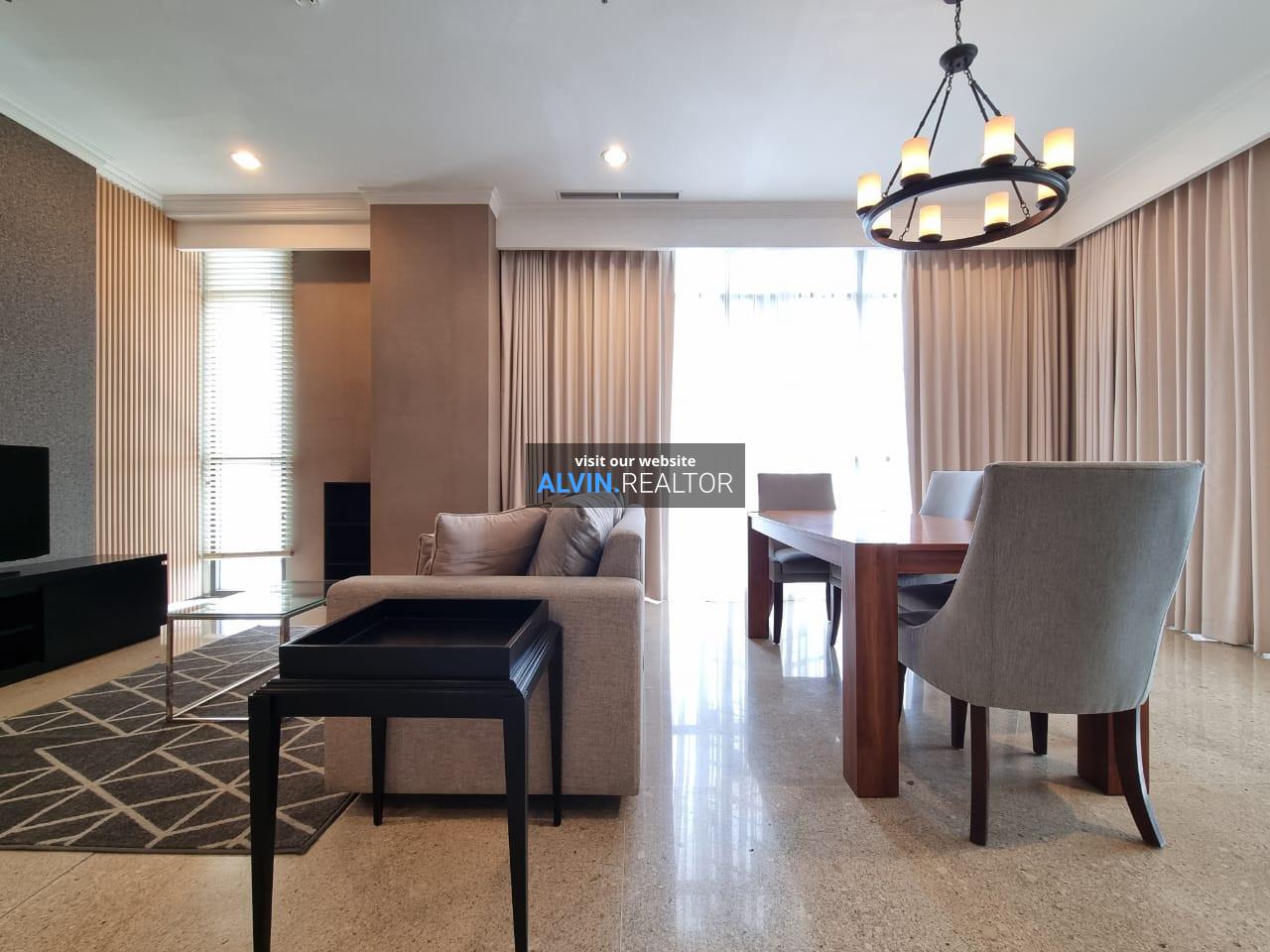 Disewa Apartemen Senopati Suites Tower 1, luas 131 m2, terdiri dari 2 kamar tidur, 2 kamar mandi, maid room, kondisi fully furnished, posisi high floor.