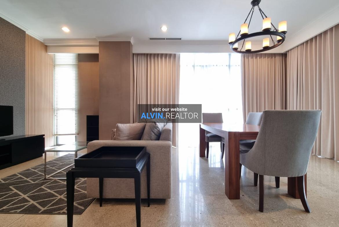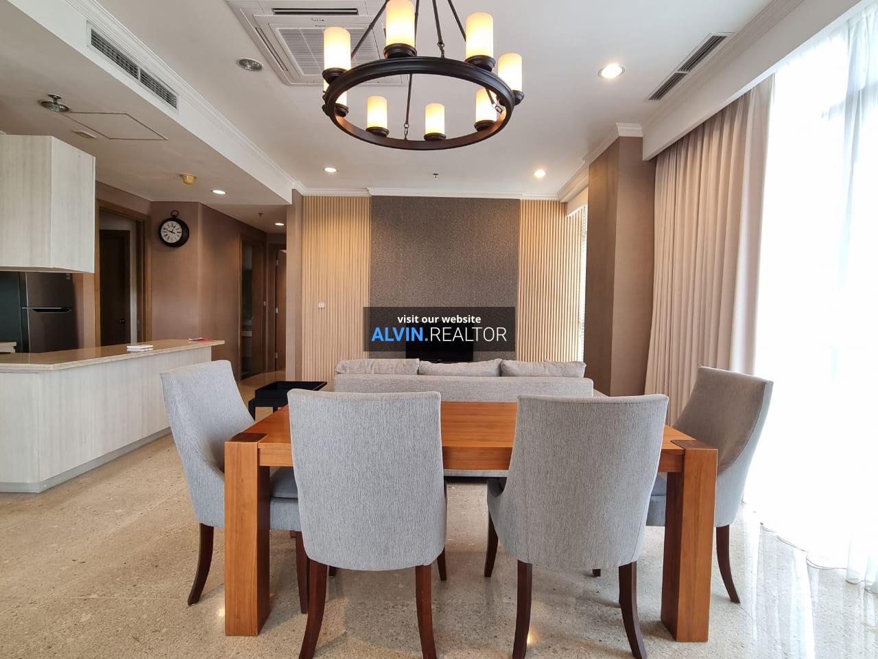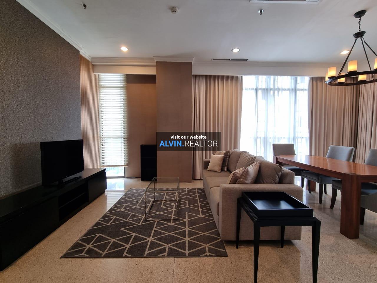 Disewa Apartemen Senopati Suites Tower 1, luas 131 m2, terdiri dari 2 kamar tidur, 2 kamar mandi, maid room, kondisi fully furnished, posisi high floor.